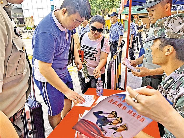 6月8日下午,征兵工作人員在龍華中學(xué)考點(diǎn)外開展了針對高考考生的征兵宣傳。