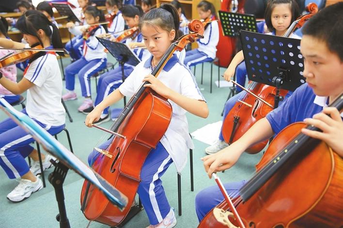 ▲海濱實驗小學深圳灣部學生放學后在校排練交響樂。