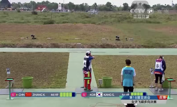 8月20日,龍崗運動員張鑫秋奪得2018年雅加達亞運會射擊賽場展開女子飛碟多向個人賽冠軍。(央視視頻截圖)