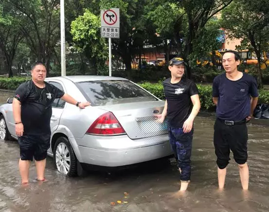 ▲ 16日,深圳市內(nèi)出現(xiàn)了大量積水,馬友們幫助涉水車主拖車 / 受訪者供圖