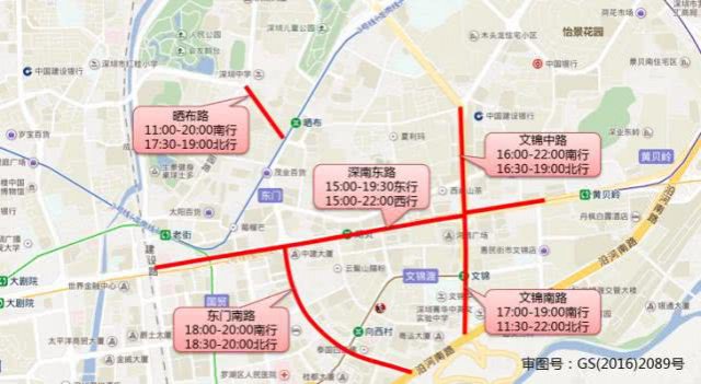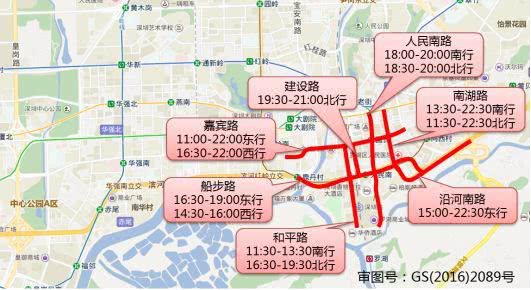 曬布路(11:00-20:00南行,17:30-19:00北行),深南東路(15:00-19:30東行,15:00-22:00西行),文錦中路(16:00-22:00南行,16:30-19:00北行),文錦南路(17:00-19:00南行,11:30-22:00北行),東門(mén)南路(18:00-20:00南行,18:30-20:00北行)。