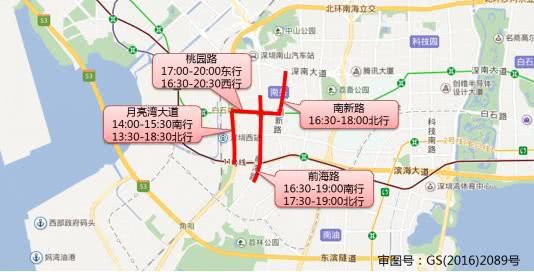 桃園路(17:00-20:00東行,16:30-20:30西行),月亮灣大道(14:00-15:30南行,13:30-18:30北行),南新路(16:30-18:00北行),前海路(16:30-19:00南行,17:30-19:00北行)。