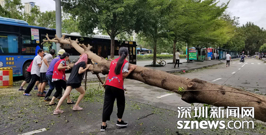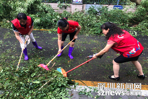 9月16日上午,蛇口街道南水社區(qū)黨委書記、婦聯(lián)主席李淑文,冒著可能被樹倒塌木砸傷的危險(xiǎn),浸泡在沒膝的雨水中幾個(gè)小時(shí)清理臺(tái)風(fēng)刮落路面的樹枝,讓來往車輛順利通行。