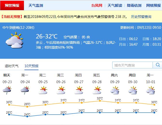 為期三天的假期就要開始了,預(yù)計(jì)深圳22日多云,午后局地有雷陣雨,氣溫26~32 ℃。23~24日多云間陰天,有短時(shí)(雷)陣雨,其中24日中秋夜多云到陰天,短暫時(shí)間可見月亮。