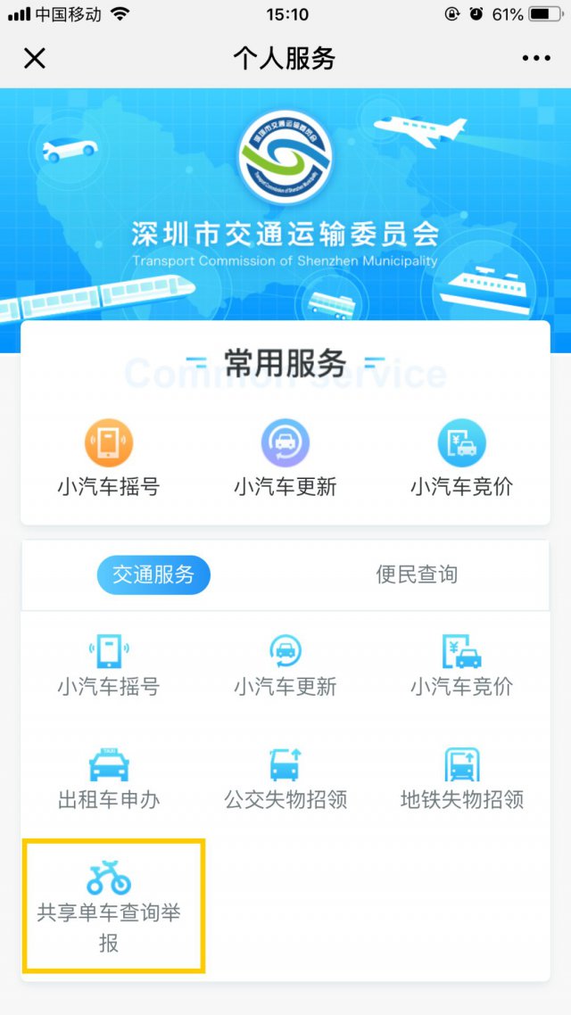 關(guān)注并進(jìn)入「深圳交委」微信公眾號;點(diǎn)擊「便民服務(wù)」菜單欄 &;在「交通服務(wù)」分類下就可以找到「共享單車查詢舉報(bào)」功能了!