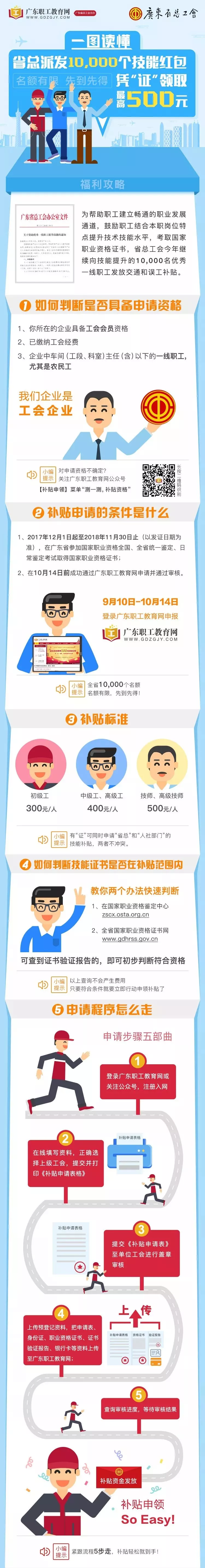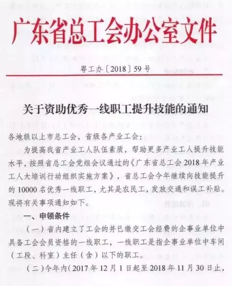 為提高我省產(chǎn)業(yè)工人隊(duì)伍素質(zhì),幫助更多產(chǎn)業(yè)工人提升技能水平,按照省總工會(huì)黨組會(huì)議通過的《廣東省總工會(huì)2018年產(chǎn)業(yè)工人大培訓(xùn)行動(dòng)組織實(shí)施方案》,省總工會(huì)繼續(xù)向10000名技能提升的優(yōu)秀產(chǎn)業(yè)工人發(fā)放交通和誤工補(bǔ)貼。取得職業(yè)資格證書可獲300~500元補(bǔ)貼,名額有限,先到先得!