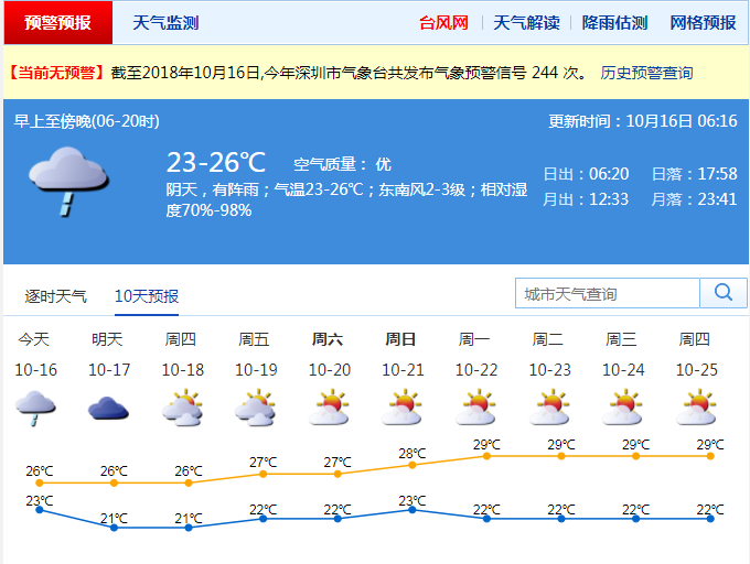 受弱冷空氣和切變線共同影響,16日深圳陰天有中到大雨,局部暴雨,伴有零散雷暴和5~6級陣風。預計降雨將在中午前后減弱,氣溫下降3 ℃~4 ℃,最低氣溫低至21 ℃,最高氣溫在25 ℃左右。17日陰天間多云,偶有零星小雨,氣溫在21 ℃ ~26 ℃。18日起轉(zhuǎn)為多云到晴天,早晚清涼,空氣干燥。