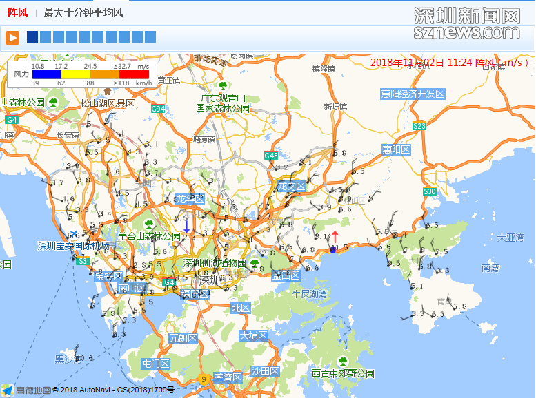 市氣象臺于11月2日11時24分發(fā)布最大十分鐘平均風值
