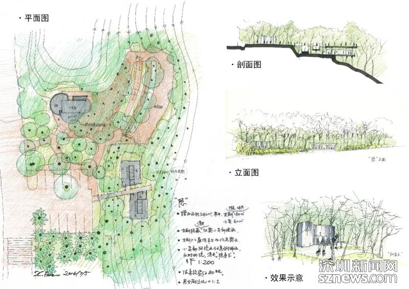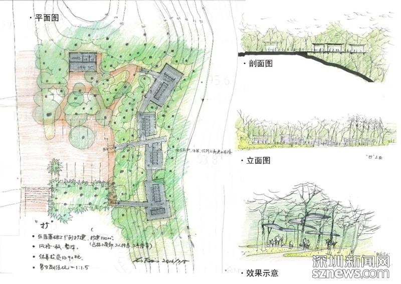 費(fèi)曉華在文中提到,“隨著深圳人口和游客的劇增,蓮花山頂公共廁所已不堪負(fù)重,急需擴(kuò)大規(guī)模。2016年,本人受蓮花山公園管理處的邀請(qǐng),免費(fèi)為他們提供了改擴(kuò)建方案。方案共有兩種思路:‘隱擴(kuò)’和‘顯擴(kuò)’,均是在保留原建筑的基礎(chǔ)上,擴(kuò)大使用面積以滿(mǎn)足更多人的需求。從更好地保護(hù)自然環(huán)境的角度出發(fā),本人推薦‘隱擴(kuò)’方案?!?(附設(shè)計(jì)圖)