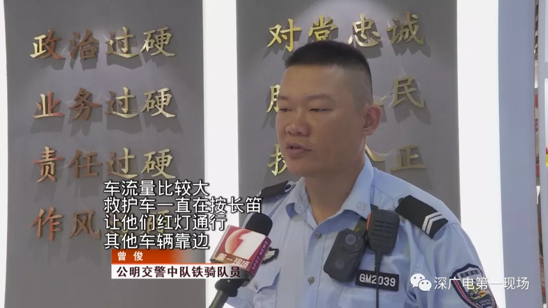 在場的四名鐵騎隊員立即進(jìn)行分工,在救護車被堵的紅綠燈口,其中一名鐵騎,曾俊首先對救護車前方等待紅燈的車輛進(jìn)行疏導(dǎo)。