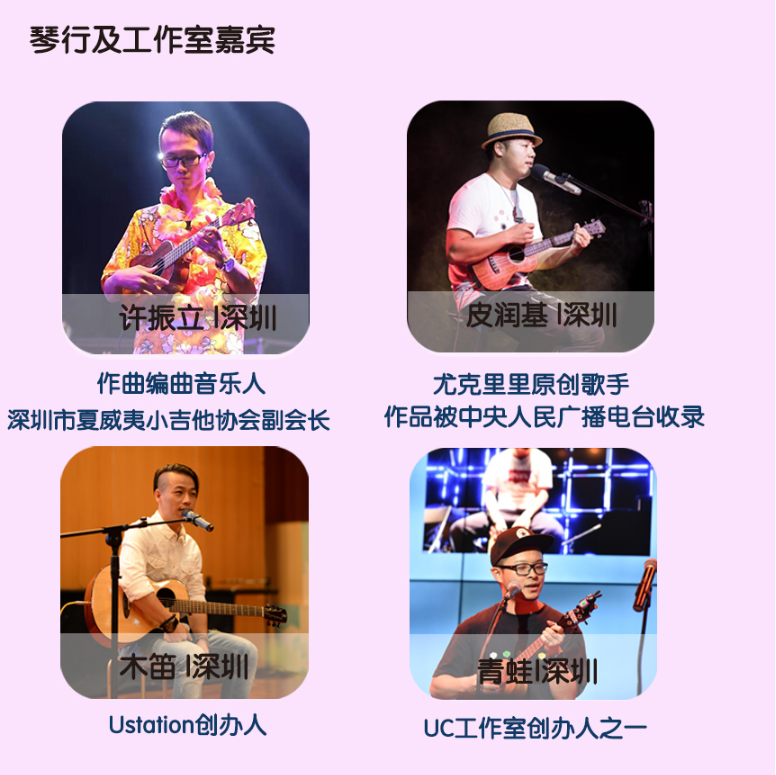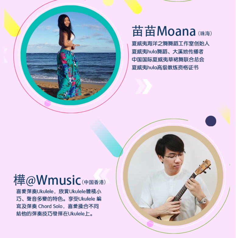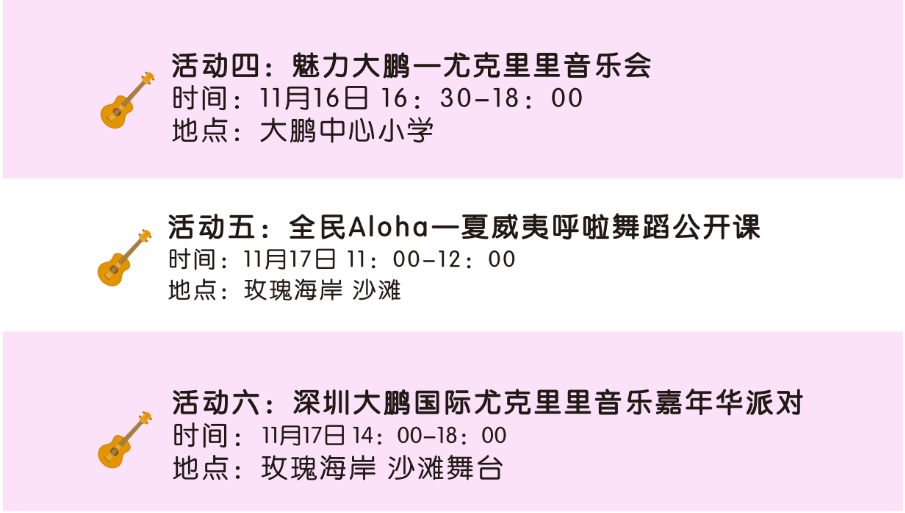 其中全民參與嘉年華音樂會(huì)11月17日的將會(huì)在深圳市玫瑰海岸沙灘舉辦,有深圳、香港(中國)、臺灣(中國)、美國、日本、廣州、中山、珠海等地的嘉賓和愛好者近50組表演者帶來4小時(shí)尤克里里盛會(huì),表演者年齡跨度更是從5歲到60歲。嘉年華現(xiàn)場除了尤克里里音樂會(huì),還將有Moana夏威夷呼拉舞風(fēng)情體驗(yàn),中國臺灣尤克里里協(xié)會(huì)會(huì)長陳建廷新書《兒童尤克里里英文暢游》深圳首發(fā),中國臺灣尤克里里世界大賽冠軍蔡皓怡原創(chuàng)專輯《航海日志》深圳首發(fā),以及美國尤克里里音樂家、藝術(shù)家新專輯《粉色海豚》尤克里里專輯中國大陸首發(fā)。