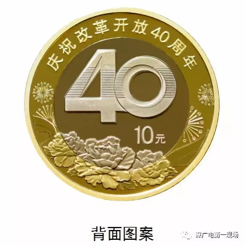 背面圖案為數(shù)字“40”造型與牡丹花組合設(shè)計(jì),并刊“慶祝改革開放40周年”字樣及面額。