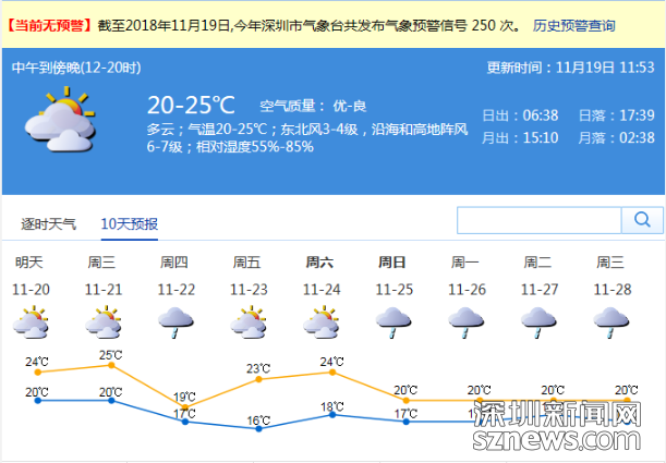 市氣象局預(yù)計,11月20-21日,深圳市以多云間陰天為主,部分時間有零星小雨; 22日受冷空氣影響,有小雨,北風(fēng)加大,氣溫下降,天氣轉(zhuǎn)涼,日溫差小。23-24日,以多云天氣為主,可見陽光,早晚清涼。