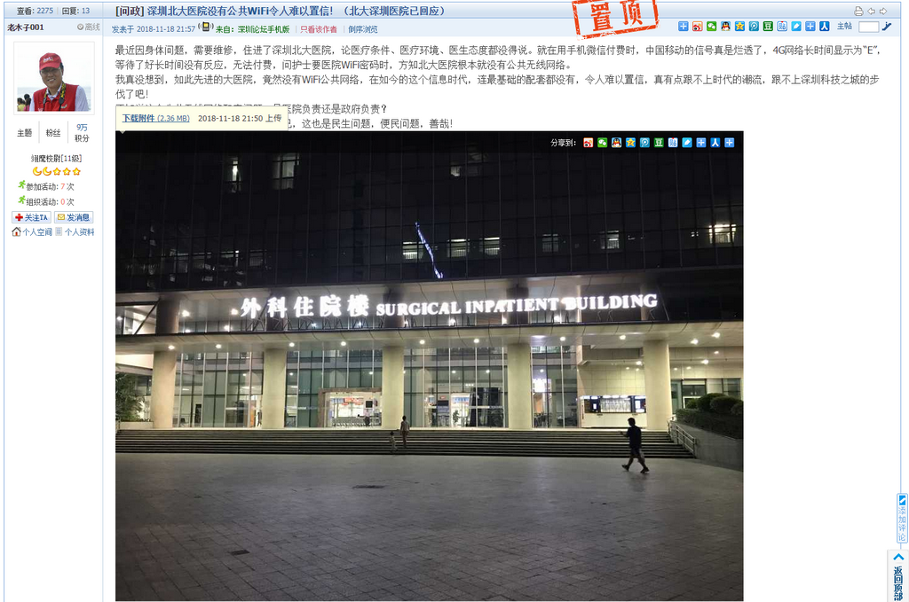 網(wǎng)友“老木子001”稱,其因身體問題到北大深圳醫(yī)院住院,在準(zhǔn)備用微信付費(fèi)時(shí),發(fā)現(xiàn)手機(jī)4G網(wǎng)絡(luò)長(zhǎng)時(shí)間顯示為“E”,無法付費(fèi)。網(wǎng)友找護(hù)士詢問醫(yī)院WiFi密碼時(shí),被告知北大深圳醫(yī)院沒有公共無線網(wǎng)絡(luò)。