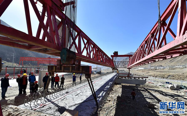中鐵大橋局工作人員在拉薩至那曲高等級(jí)公路昂嘎大橋施工現(xiàn)場(chǎng)作業(yè)。新華社記者覺(jué)果 攝
