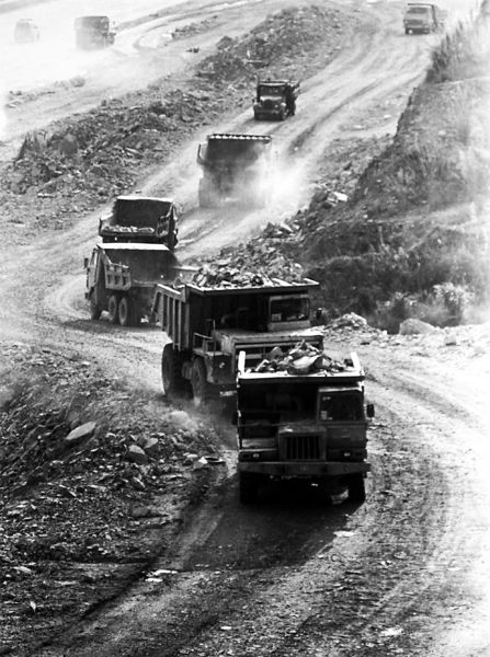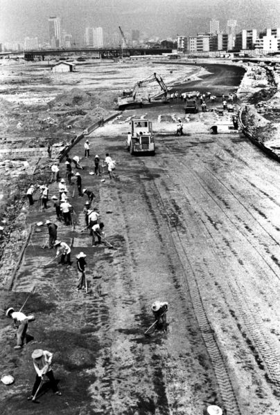 1994年,修建濱海大道時泥頭車運泥填海。鄭東升 攝