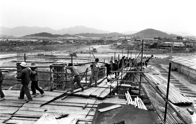 1992年,中心區(qū)四橋一廣場進入緊張施工,圖為金田立交橋的施工情景,背景是蓮花山。 馬樹華 攝