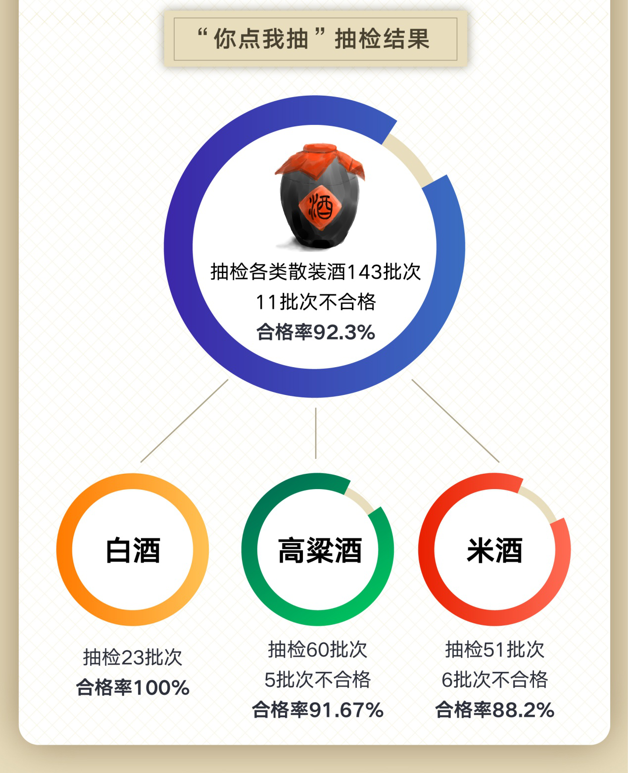 根據(jù)投票結(jié)果,此次共抽檢各類散裝酒143批次,11批次不合格,合格率92.3%。其中,抽檢白酒23批次,合格率100%;抽檢高粱酒60批次,5批次不合格,合格率91.67%;抽檢米酒51批次,不合格6批次,合格率88.2%。