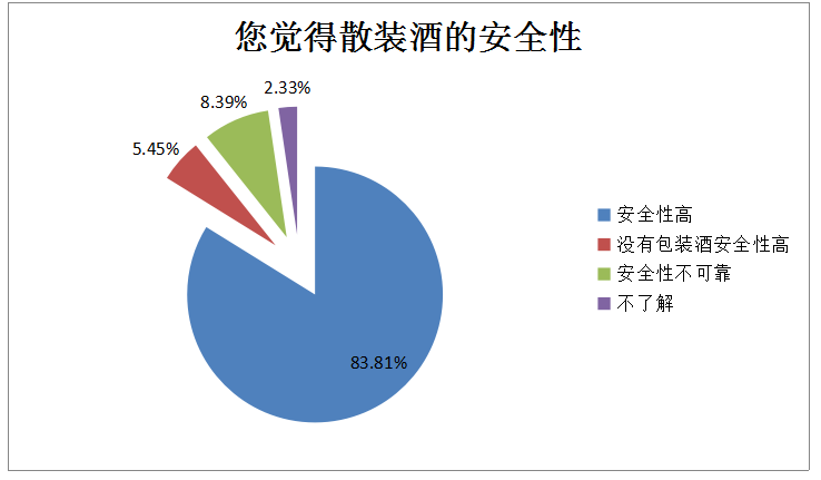 深圳人對散裝酒安全性的評價如何?83.81%的網(wǎng)民還是認(rèn)為安全性高;只有8.39%的網(wǎng)民和5.45%的網(wǎng)民認(rèn)為安全性不可靠、沒有包裝酒安全性高。
