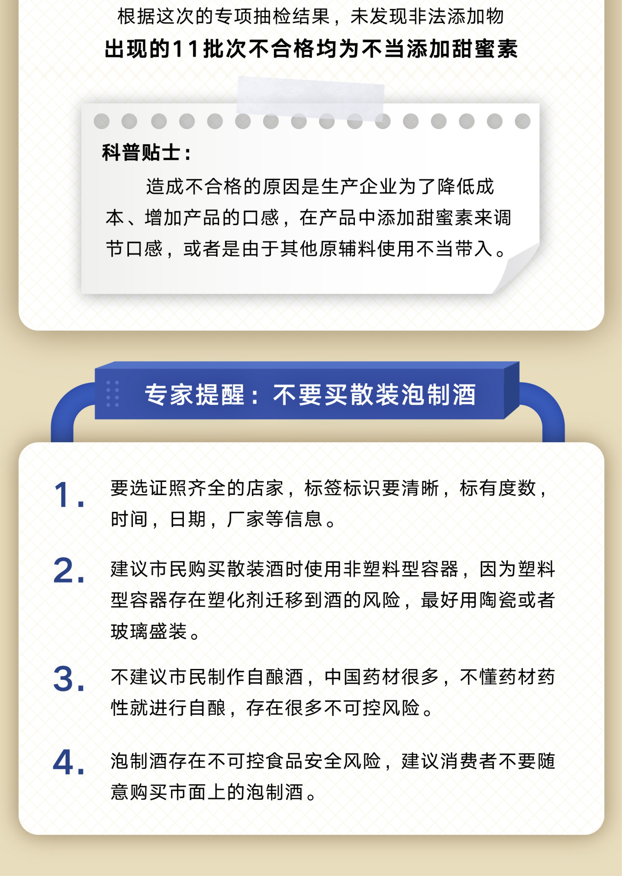 4.泡制酒存在不可控食品安全風(fēng)險(xiǎn),建議消費(fèi)者不要隨意購(gòu)買市面上的泡制酒。