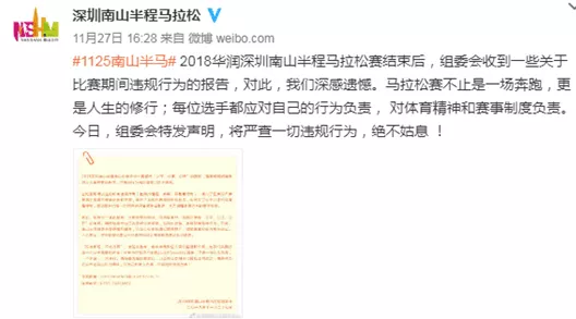 27日,南山半馬賽事組委會通過微博發(fā)布聲明稱,在比賽現(xiàn)場發(fā)生的所有違規(guī)行為,侵占了正常報名參賽選手有限的賽事補(bǔ)給和資源,破壞了馬拉松賽場規(guī)則和秩序,也違反了公平公正的體育精神等,現(xiàn)場裁判已第一時間將違規(guī)者清除出賽道,全力保障參賽選手的基本權(quán)益。