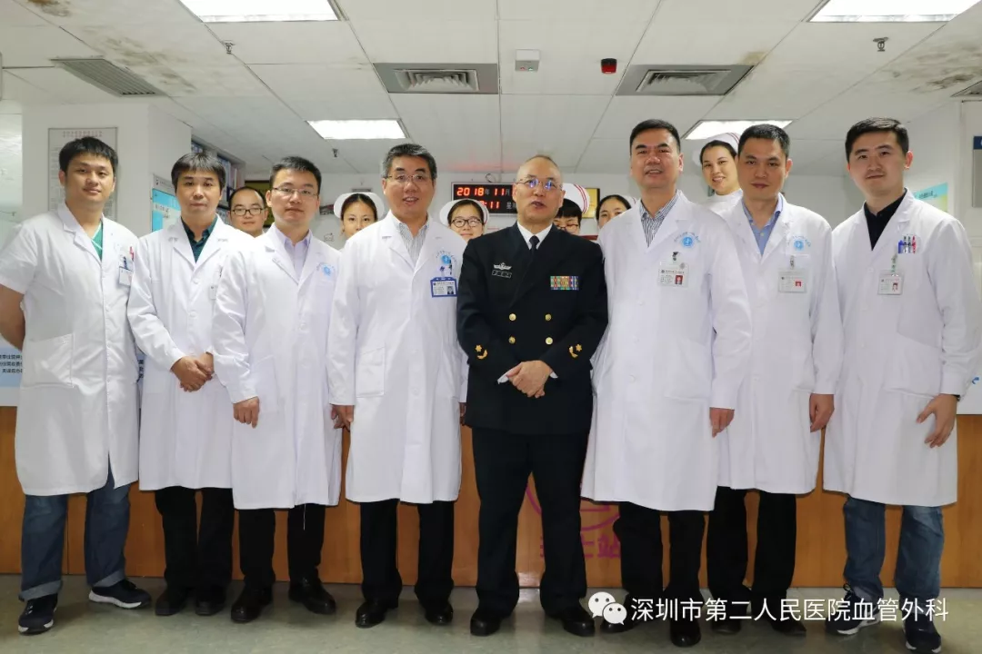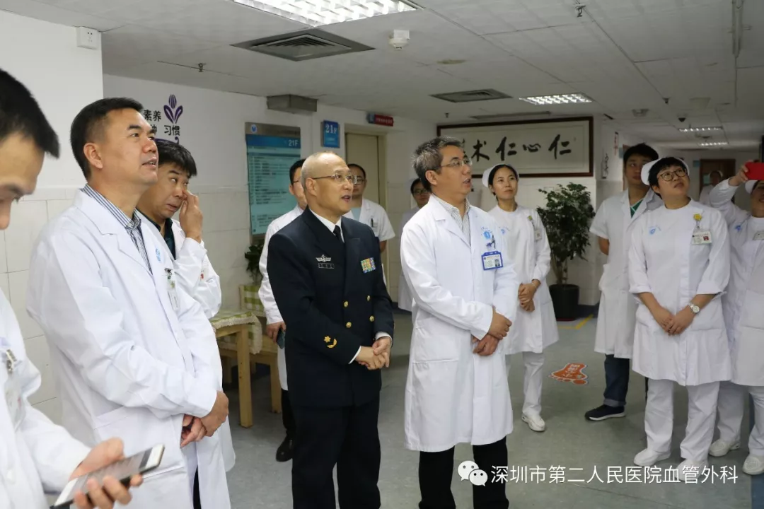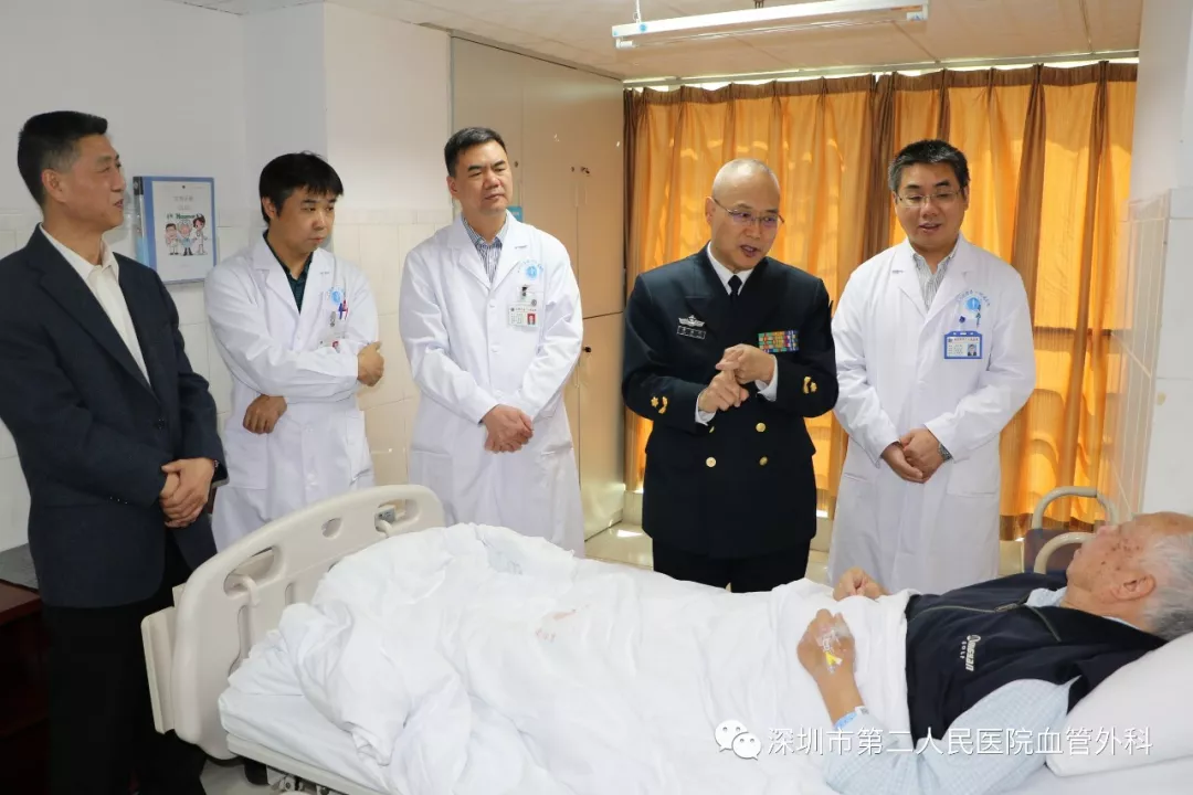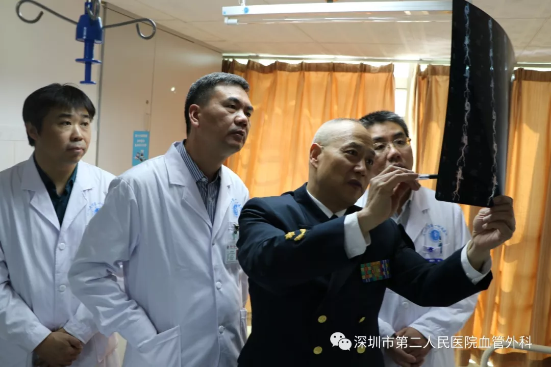 座談會(huì)結(jié)束后,景在平教授、趙永勝副院長(zhǎng)與科室醫(yī)護(hù)人員一起,進(jìn)行了床邊臨床教學(xué)查房,同時(shí)為一位腹主動(dòng)脈瘤疾病患者會(huì)診?;颊呤强姑涝嫌⑿郏ㄏ硎苘娂?jí)待遇),因發(fā)現(xiàn)腹主動(dòng)脈瘤(俗稱(chēng)“不定時(shí)炸彈”)后,一直深受該疾病困擾,一度不愿意接受治療。經(jīng)過(guò)景在平教授詳細(xì)講解后豁然開(kāi)朗,同意接受治療,并要求在景在平教授團(tuán)隊(duì)及朱國(guó)獻(xiàn)主任團(tuán)隊(duì)下進(jìn)行手術(shù)治療。會(huì)診結(jié)束時(shí),老先生緊緊握住景在平教授的手,萬(wàn)分感激。