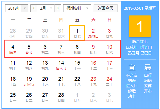 2019年春節(jié)是2月5日(星期二),根據(jù)規(guī)定春節(jié)法定放假時(shí)間是初一到初六,調(diào)休7天。2019年2月2日、2月3日需上班調(diào)休。
