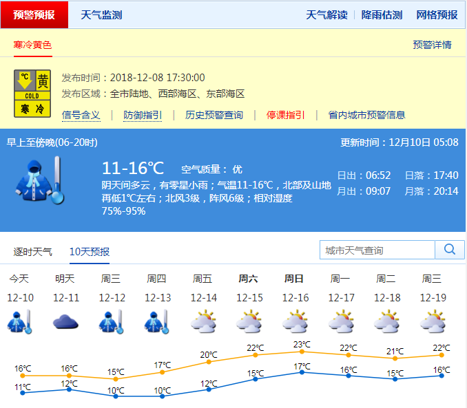 據(jù)了解,受冷空氣補(bǔ)充影響,深圳10日陰天間多云,偶有零星小雨,早晨最低氣溫10-11℃,天氣陰冷;11日云量較多,日溫差??;12-13日新一股冷空氣影響,多云可見陽光,最低氣溫將降至10℃或以下;14日冷空氣減弱,氣溫回升。預(yù)計(jì)寒冷黃色預(yù)警信號(hào)將持續(xù)至13日前后。