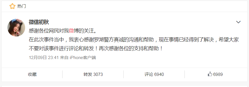 9日晚,網(wǎng)友“微信初秋”再次發(fā)文表示:事情已經(jīng)得到解決,感謝網(wǎng)友關(guān)注