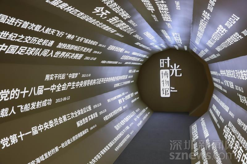 進(jìn)入時(shí)光博物館,最先通過的是由40年來《人民日報(bào)》各個(gè)時(shí)期重點(diǎn)新聞報(bào)道的標(biāo)題聚合而成的時(shí)光隧道