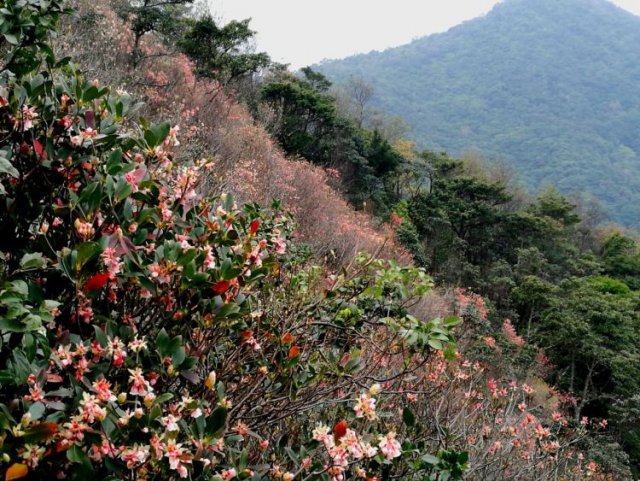 登上梧桐山,遠(yuǎn)看,這片山林如秋日層林盡染,層層綠障中帶著紅邊。吊鐘花自然分布在海撥400m以上山體,主要小梧桐到大梧桐山頂坡面,尤其山脊線兩側(cè)較多。近兩年加強(qiáng)了撫育,現(xiàn)在,小梧桐杜鵑谷(10畝)、葫蘆徑至疊翠亭(30畝)、大梧桐頂(20畝)吊鐘花開花情況較好,都能賞吊鐘。吊鐘較長的花梗下垂懸掛著形如鈴鐺的花朵,其獨(dú)特的花形也讓吊鐘有了鈴兒花、倒掛金鐘、燈籠花等別稱。吊鐘是一種落葉或半常綠灌木,樹不高,通常3米左右。