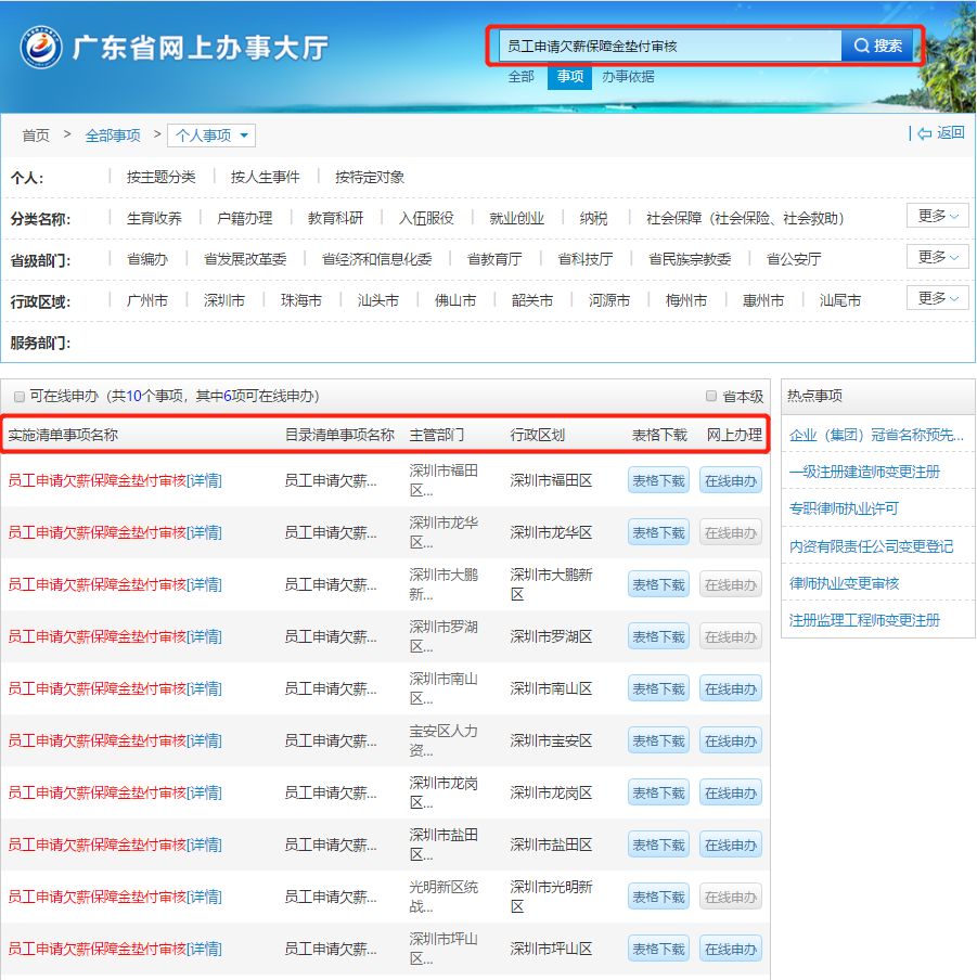 答:員工登錄廣東省網(wǎng)上辦事大廳官網(wǎng),點(diǎn)擊“個(gè)人事項(xiàng)”,在搜索欄中輸入“員工申請(qǐng)欠薪保障金墊付審核”,可查詢(xún)到各區(qū)“員工申請(qǐng)欠薪保障金墊付審核”事項(xiàng),選擇所在區(qū)點(diǎn)擊“詳情”,即可查詢(xún)到所在區(qū)人力資源部門(mén)的咨詢(xún)電話、辦理地址、辦理時(shí)間和交通指引等相關(guān)信息。