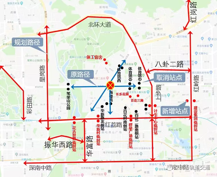 (2)原經(jīng)筍崗西路西行-華富路、泥崗西路南行-華富路-華新路到達(dá)的交通調(diào)整為:上步路-紅荔路-華強(qiáng)北路-華新路/上步路-筍崗西路-百花四路-華新路。