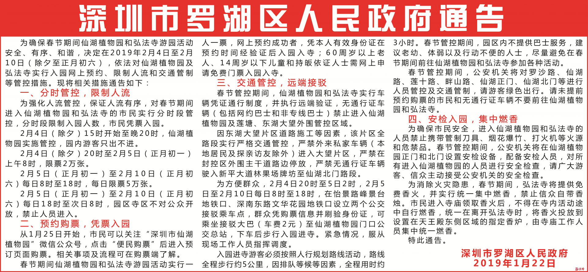 為確保春節(jié)期間仙湖植物園和弘法寺游園活動安全、有序、和諧,決定在2019年2月4日至2月10日(除夕至正月初六),依法對仙湖植物園及弘法寺實行入園網上預約、限制人流和交通管制等管控措施?,F將相關措施通告如下:
