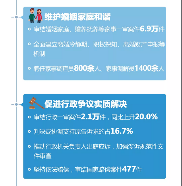 深圳新聞網(wǎng)2019年1月30日訊(記者 張玲 牛耘 發(fā)自廣州)1月30日上午,廣東省十三屆人大二次會(huì)議舉行第二次全體會(huì)議,人大、兩院報(bào)告內(nèi)容齊亮相。2018年,廣東法院做了哪些工作,交出了一份怎樣的成績(jī)單?廣東省高級(jí)人民法院院長(zhǎng)龔稼立在廣東省高級(jí)人民法院工作報(bào)告中公布了一組數(shù)據(jù):2018年,全省法院新收各類(lèi)案件203.7萬(wàn)件,審結(jié)204.5萬(wàn)件,同比分別上升13.8%和14.4%;法官人均結(jié)案277件,同比上升12.8%;案件再審糾錯(cuò)率1.2‰,案訪(fǎng)比連續(xù)下降。其中,省法院新收各類(lèi)案件3.3萬(wàn)件,審結(jié)3萬(wàn)件,同比分別上升17.1%和12.3%。
