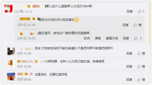 還有一些網友借機表達了自己對某類人的"墻裂"不滿?。]事兒拉什么球框啊,以為在打 NBA?。ⅲ⒒钤摚蚯蚓蜔┎荒芸圻€裝 X的"......