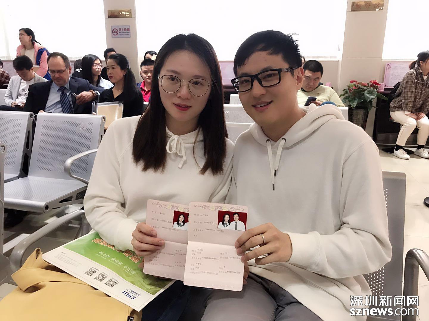 曾林雪和丈夫劉家勇在龍華區(qū)婚姻登記處拍照