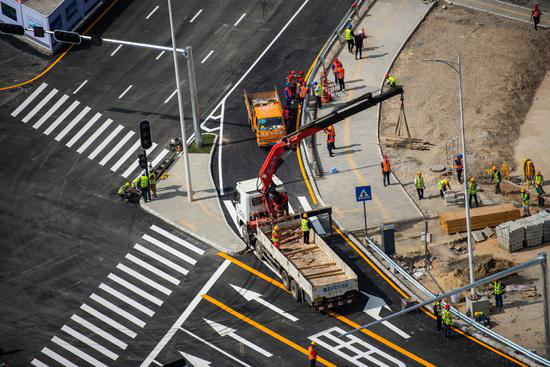 圖為部分交通信號(hào)燈已安裝就位。