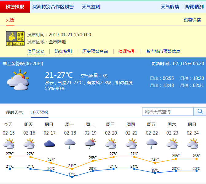 市氣象局預(yù)計(jì),15-16日深圳市可見(jiàn)陽(yáng)光,溫暖濕潤(rùn)早晚有(輕)霧,氣溫在20-28℃;17-18日天氣轉(zhuǎn)涼,沿海及高地陣風(fēng)可達(dá)8級(jí);18日有小到中雨;19日小雨轉(zhuǎn)多云。請(qǐng)市民注意關(guān)注低能見(jiàn)度和大風(fēng)對(duì)交通和戶外作業(yè)安全的影響。