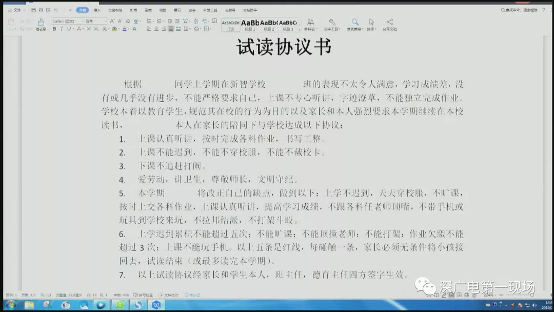 這份《試讀協(xié)議書》的大概內(nèi)容如下:由于某某同學上學期表現(xiàn)不令人滿意,學習成績差,沒有或幾乎沒有進步,不能嚴格要求自己。學生在家長的陪同下與學校達成以下協(xié)議。協(xié)議第六條注明:上學遲到累計不能超過5次;不能曠課;不能頂撞老師;不能打架;作業(yè)欠繳不能超過3次;上課不能玩手機。以上條款是紅線,每觸碰一條,家長必須無條件將小孩接回去,試讀結束。或者最多讀完本學期。
