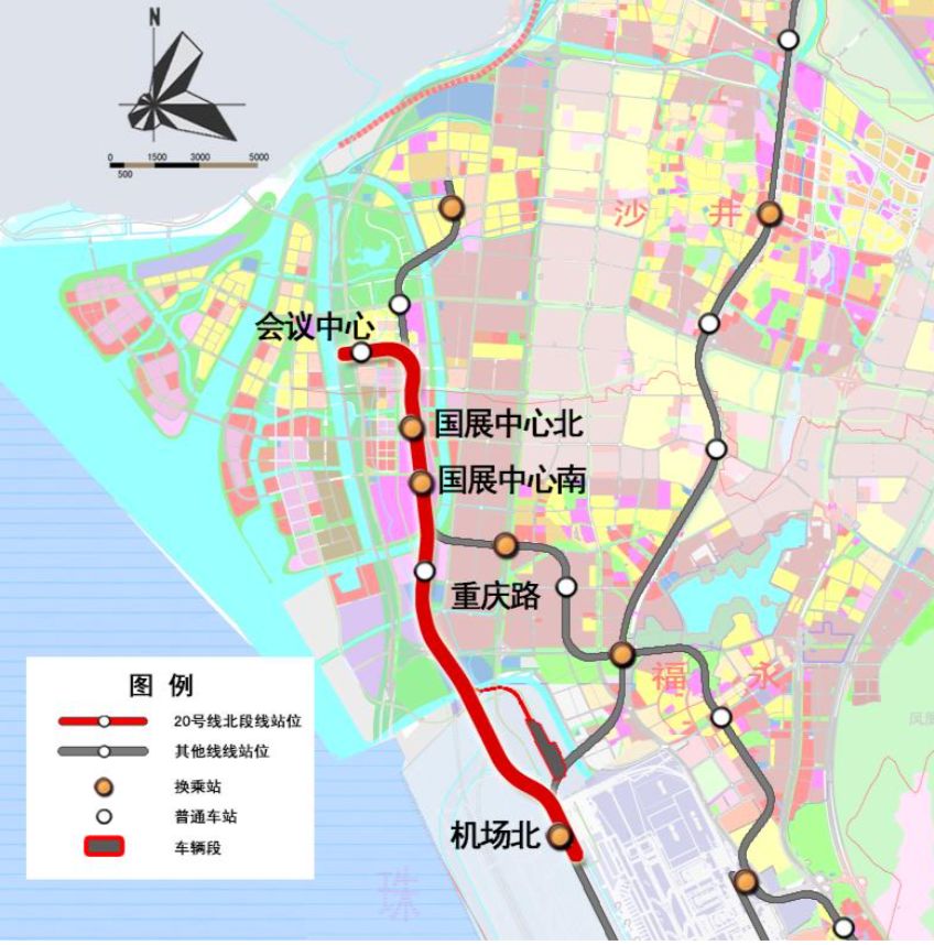20號(hào)線北段起于寶安國(guó)際機(jī)場(chǎng)規(guī)劃 T4航站樓,在規(guī)劃 T4航站樓北側(cè),11號(hào)線東側(cè)設(shè)機(jī)場(chǎng)北站,與11號(hào)線、穗莞深城際線換乘。之后線路往北沿展覽大道敷設(shè),經(jīng)蠔業(yè)路后轉(zhuǎn)向北,于重慶路北側(cè),展覽大道東側(cè)設(shè)重慶路站。線路繼續(xù)往北,沿新會(huì)展中心東側(cè)道路敷設(shè),于景芳路南側(cè)設(shè)國(guó)展中心南站,與12號(hào)線換乘,在鳳塘大道路口設(shè)國(guó)展中心北站,與12號(hào)線、30號(hào)線換乘。線路自國(guó)展中心北站引出后,于和蕙路向東敷設(shè),于海濱大道東側(cè)設(shè)會(huì)議中心站。線路全長(zhǎng)約8.4km,采用地下敷設(shè)。