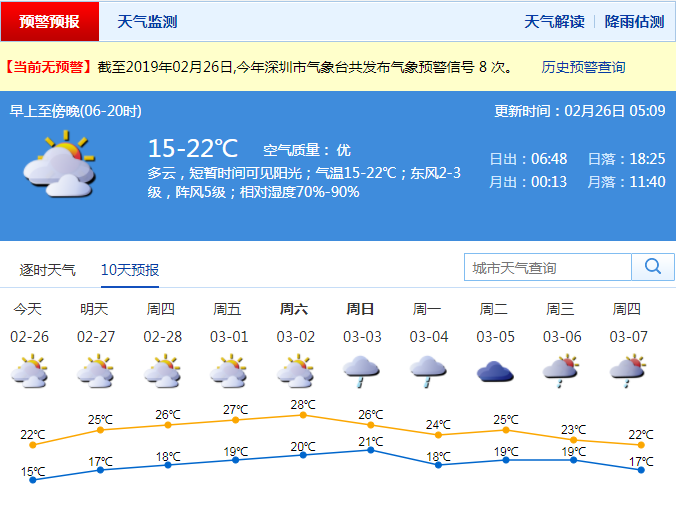 市氣象局預(yù)計,27日-3月2日多云間陰天,可見陽光,早晚有輕霧或霧,天氣溫暖濕潤;3月3-4日有分散小雨,氣溫略降。3月深圳市天氣偏暖,空氣潮濕,雨霧等低能見度天氣易發(fā),仍有3-4次弱冷空氣影響,強度比本次冷空氣弱,但冷空氣活動時氣溫都會比前日略降,并轉(zhuǎn)陰雨天氣。