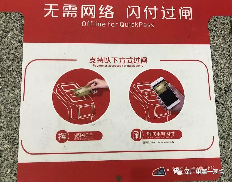 記者了解到,深圳市地鐵已全面受理金融IC卡及銀聯(lián)閃付,金融IC卡指的是各銀行發(fā)行的印有銀聯(lián)標(biāo)識(shí)及閃付“QuickPass”標(biāo)識(shí)的芯片銀行卡(包括借記卡和信用卡);銀聯(lián)閃付支持HuaweiPay、ApplePay、SamsungPay、MiPay等各種手機(jī)Pay,消費(fèi)者無需解鎖手機(jī)和打開APP,即可完成支付。市民在地鐵站內(nèi)貼有“銀聯(lián)閃付”、“全國(guó)交通一卡通”標(biāo)識(shí)的閘機(jī)前,便可直接用金融IC卡、手機(jī)刷卡進(jìn)出站,也可在無網(wǎng)絡(luò)的條件下直接用于地鐵過閘。