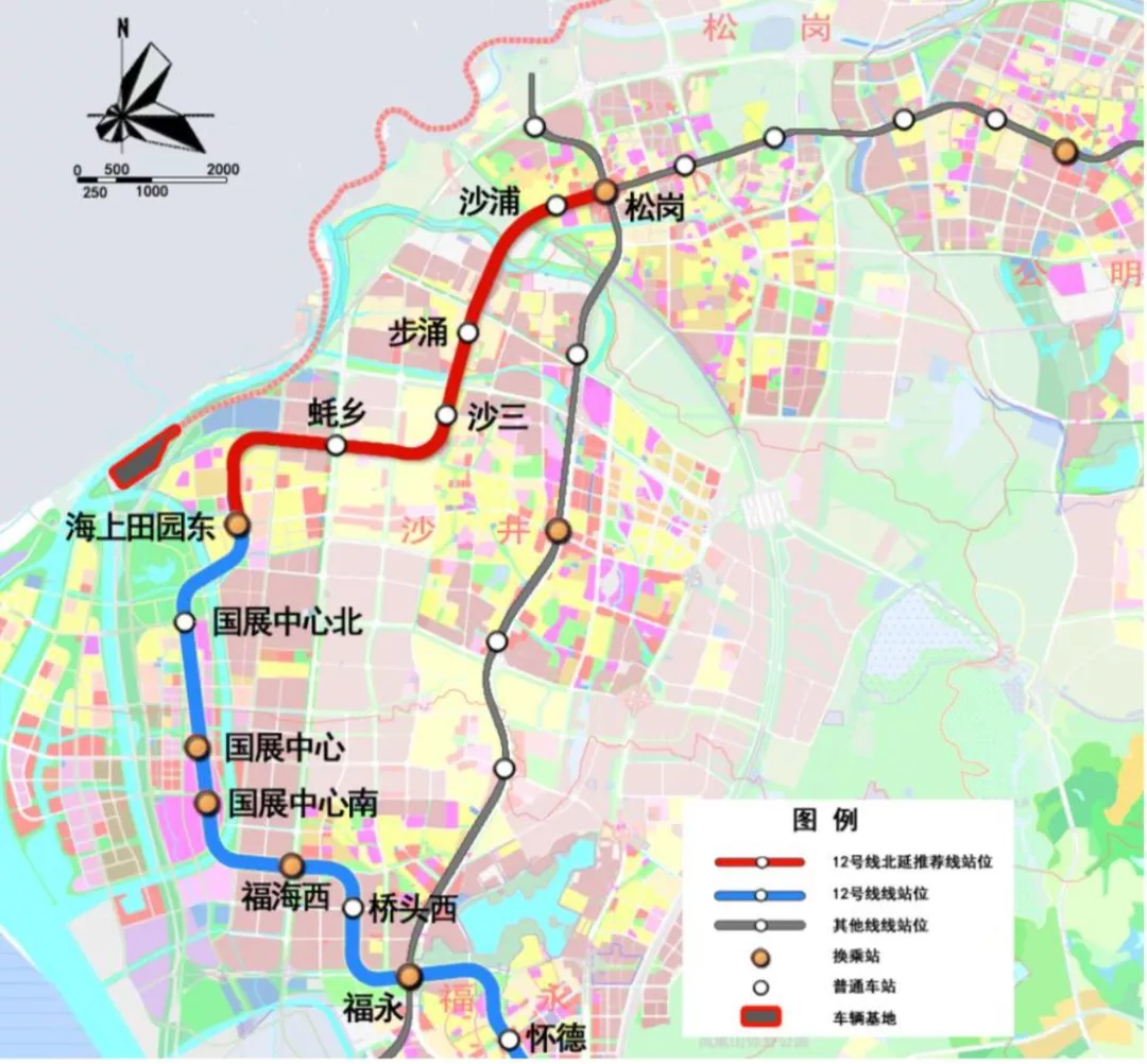 12號線北延線由在建地鐵12號線海上田園東站后,至沙江路與寶安大道交叉口前設置松崗站,與在建地鐵6號線和既有地鐵11號線換乘。全長約8.2公里,采用地下敷設。