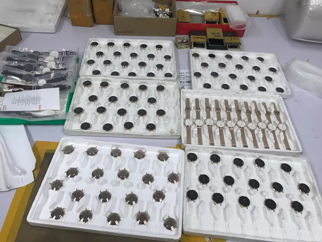 2018年6月21日,深圳市公安局經(jīng)偵支隊(duì)聯(lián)合市市場(chǎng)監(jiān)管部門開展打擊假冒DW品牌手表、FOREO等品牌潔面儀收網(wǎng)行動(dòng),共出動(dòng)警力110人,查處窩點(diǎn)13個(gè),刑拘犯罪嫌疑人12人。現(xiàn)場(chǎng)查扣假冒DW品牌手表13500塊,表帶、表殼、后蓋等配件43000個(gè)以及包裝盒、標(biāo)簽12000余個(gè),現(xiàn)場(chǎng)查扣假冒產(chǎn)品價(jià)值1200萬(wàn)元人民幣,總涉案金額3000余萬(wàn)元人民幣。查扣假冒各品牌美容產(chǎn)品、半成品和商標(biāo)標(biāo)識(shí)11798件,查扣假冒產(chǎn)品價(jià)值人民幣500萬(wàn)元。經(jīng)查,上述犯罪團(tuán)伙在未經(jīng)注冊(cè)商標(biāo)所有人許可的情況下,擅自使用注冊(cè)的商標(biāo)圖案組裝、翻新假冒DW品牌手表、FOREO品牌潔面儀。經(jīng)商標(biāo)權(quán)利人鑒定,現(xiàn)場(chǎng)查獲的手表和美容儀為假冒其注冊(cè)商標(biāo)的產(chǎn)品。