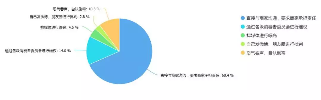 有68.4%的受訪者在遇到消費侵權(quán)后選擇直接與商家溝通,要求商家承擔責任,10.4%的受訪者會選擇忍氣吞聲、自認倒霉;其中男性消費者更傾向于找媒體曝光,而女性消費者則傾向于忍氣吞聲。