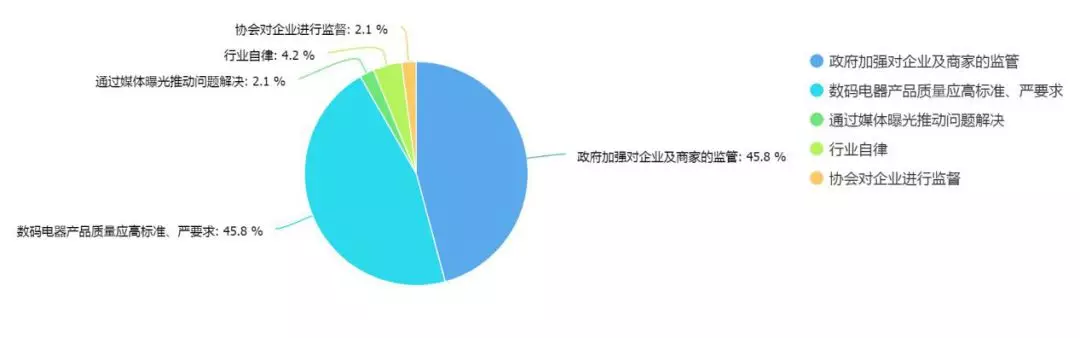 針對目前數(shù)碼家電行業(yè)中存在的相關(guān)問題,有45.8%的消費者建議通過政府加強對企業(yè)及商家的監(jiān)管,另有部分網(wǎng)民建議數(shù)碼家電類產(chǎn)品應(yīng)該設(shè)立更高的的標準,對企業(yè)應(yīng)該提出更高的要求。