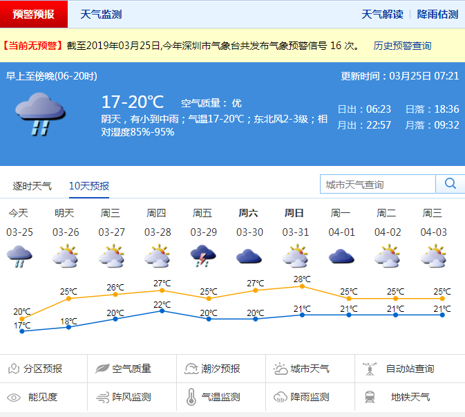 深圳新聞網(wǎng)2019年3月25日訊 今日仍陰涼有雨,降雨主要出現(xiàn)在凌晨至午后,有小雨到中雨,局部大雨,可能有零散雷暴。深圳市氣象局預計26日起轉(zhuǎn)多云可見陽光,氣溫逐日回升,27-28日暖濕有霧,最高氣溫可回升至25℃以上。