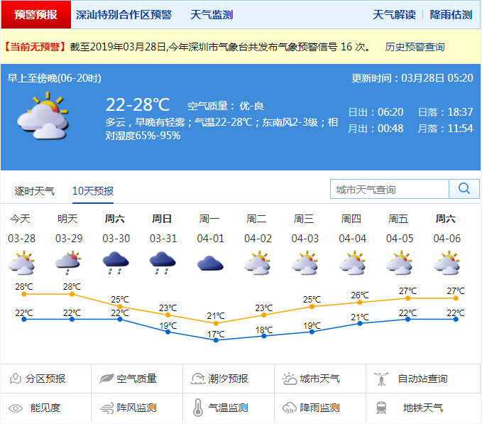深圳新聞網2019年3月28日訊  深圳今日多云,早晚有輕霧或霧;20-27℃;南風2-3級;濕度60%-95%。預計29日多云轉陣雨;30-31日冷空氣影響,陰天有陣雨或雷陣雨,天氣轉涼;4月1日陰轉多云,偶有零星小雨;2日起氣溫逐日回升。