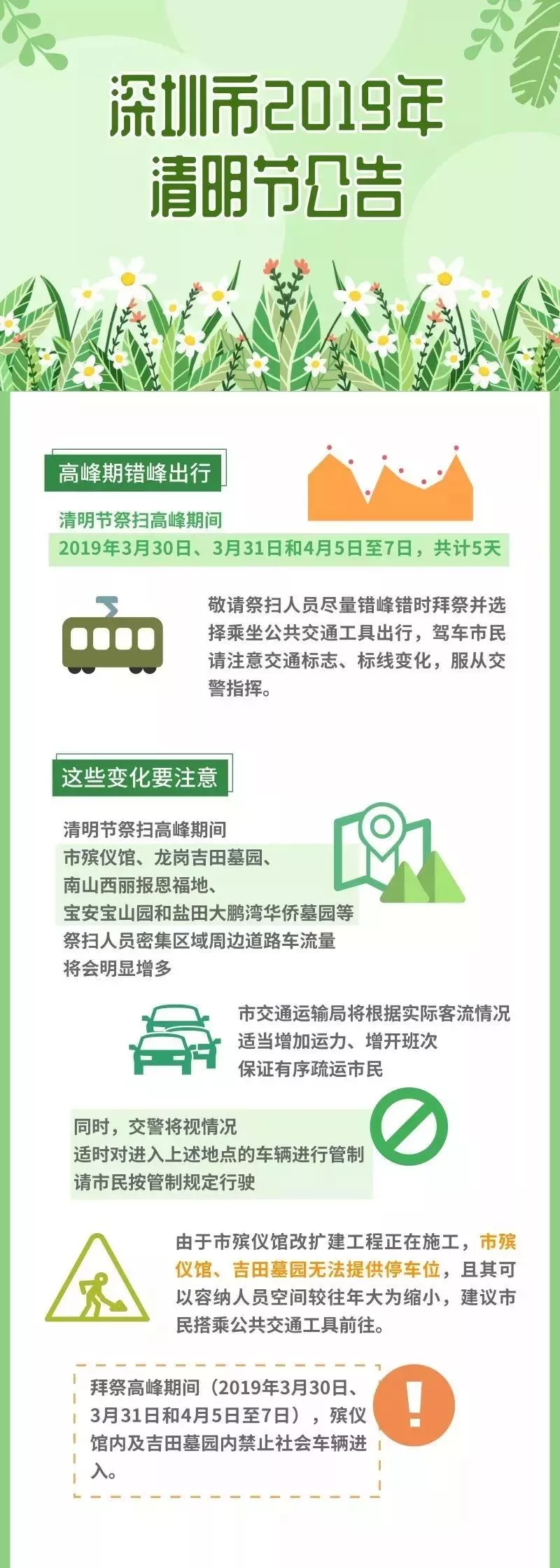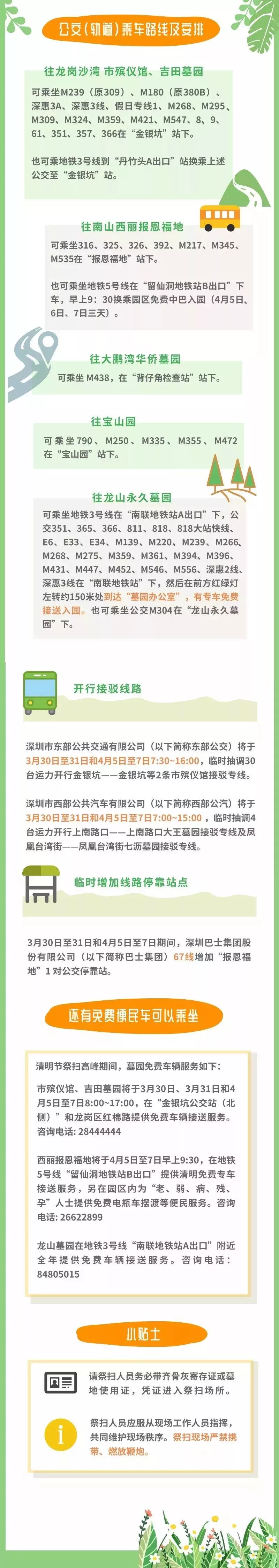 交警部門將視情況對上述地點進行交通管制,為滿足市民朋友出行祭掃需要,除了給大家準備出行指引外還將開行墓園接駁專線、增加??空?、增加運力請大家文明出行、綠色出行。
